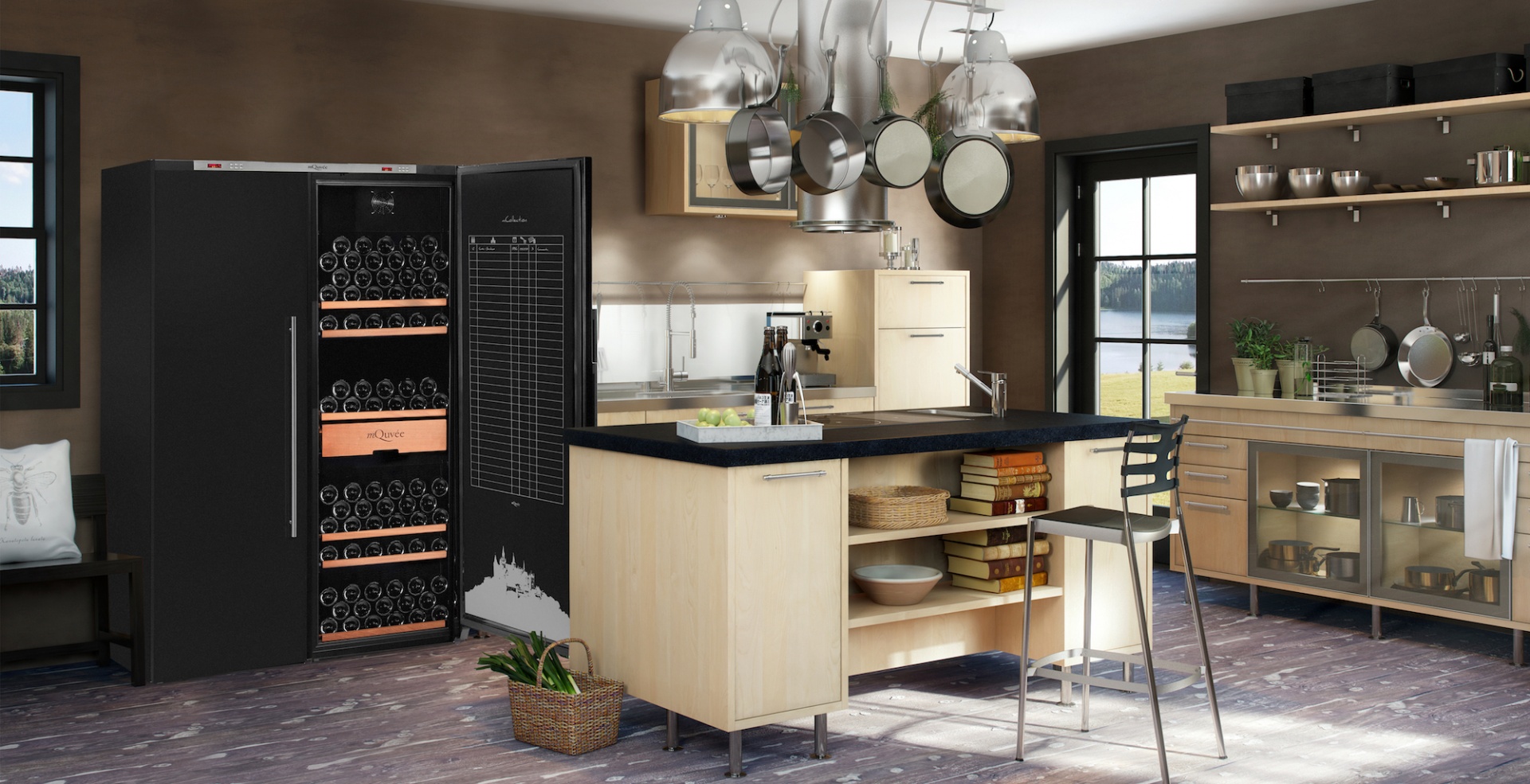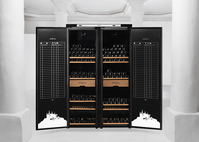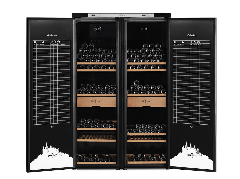Garrafeira mQuvée com espaço para até 474 garrafas. Um equipamento exclusivo com humidade ajustável, ficha de catalogação de vinhos, prateleiras em madeira e duas caixas. O equipamento para guarda e conservação de vinhos consiste em dois modulos pré-montados com portas sólidas em preto.